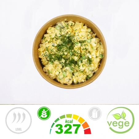 Składniki: Ziemniaki (19%), Ogórki Kiszone (Ogórki, Woda, Sól, Przyprawy w tym GORCZYCA) (15%), JAJA KURZE Gotowane i Obrane, Woda, Sól, Regulatory Kwasowości: Kwas Cytrynowy, Kwas Octowy, Kwas Mlekowy, Marchew, Pietruszka, SELER, Groszek Zielony, Majonez Domowy (Olej Rzepakowy, Pasteryzowane Żółtka JAJ, Musztarda), Musztarda (Woda, Ocet Spirytusowy, GORCZYCA, Cukier, Sól, Przyprawy), Natka Pietruszki, Sól, Pieprz Czarny.